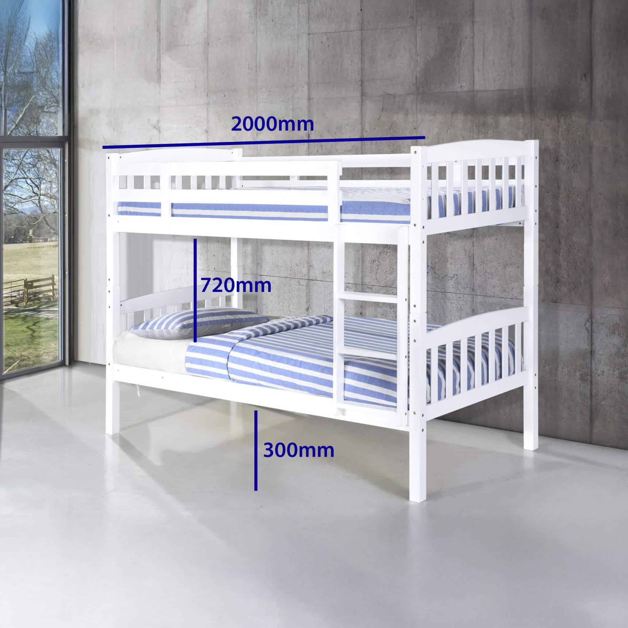 Ashbrook Bunk – Solid Wood – Single – White – Splits into two beds, 2000W, Height between top and bottom beds: 720H, Height from floor to bottom bed: 300H