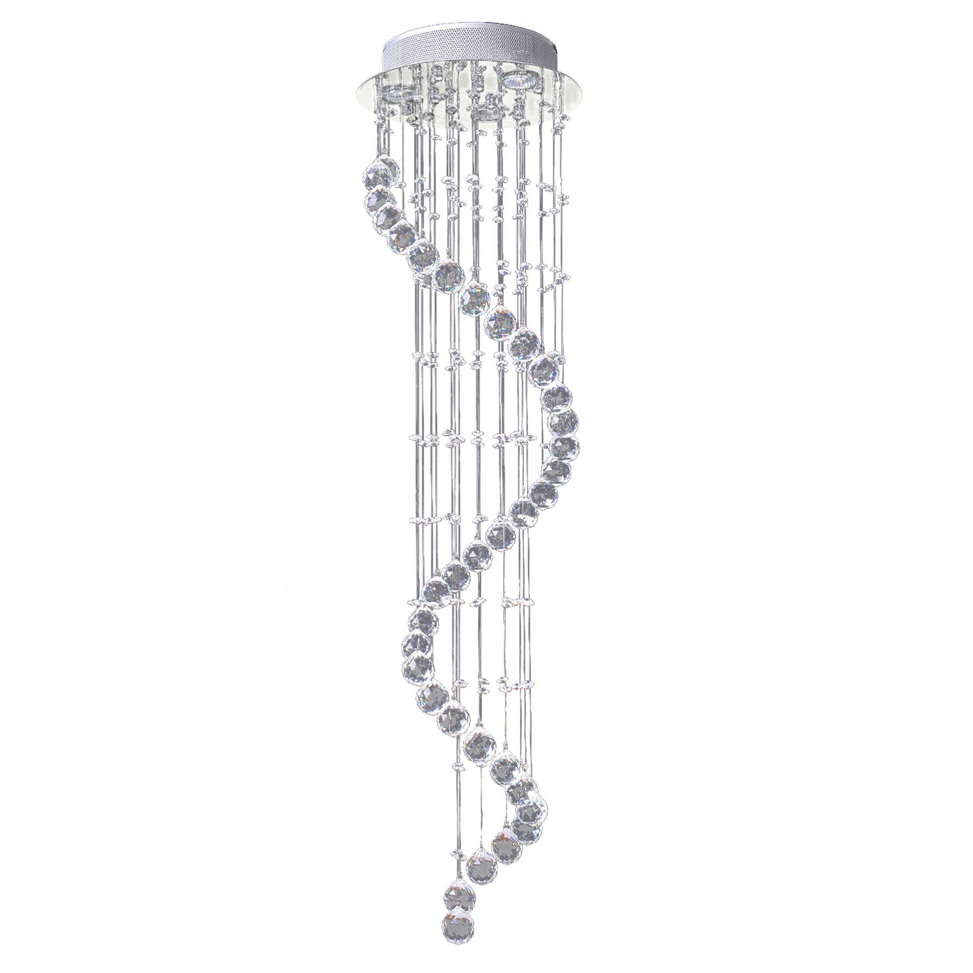- CRYSTAL & SHINING STYLE: This crystal spiral sphere raindrop ceiling light with polished chrome finish and numerous chains of clear glass faceted beads to create a romantic and lovely atmosphere. Those hang down crystal pendant added extra sparkling effect.