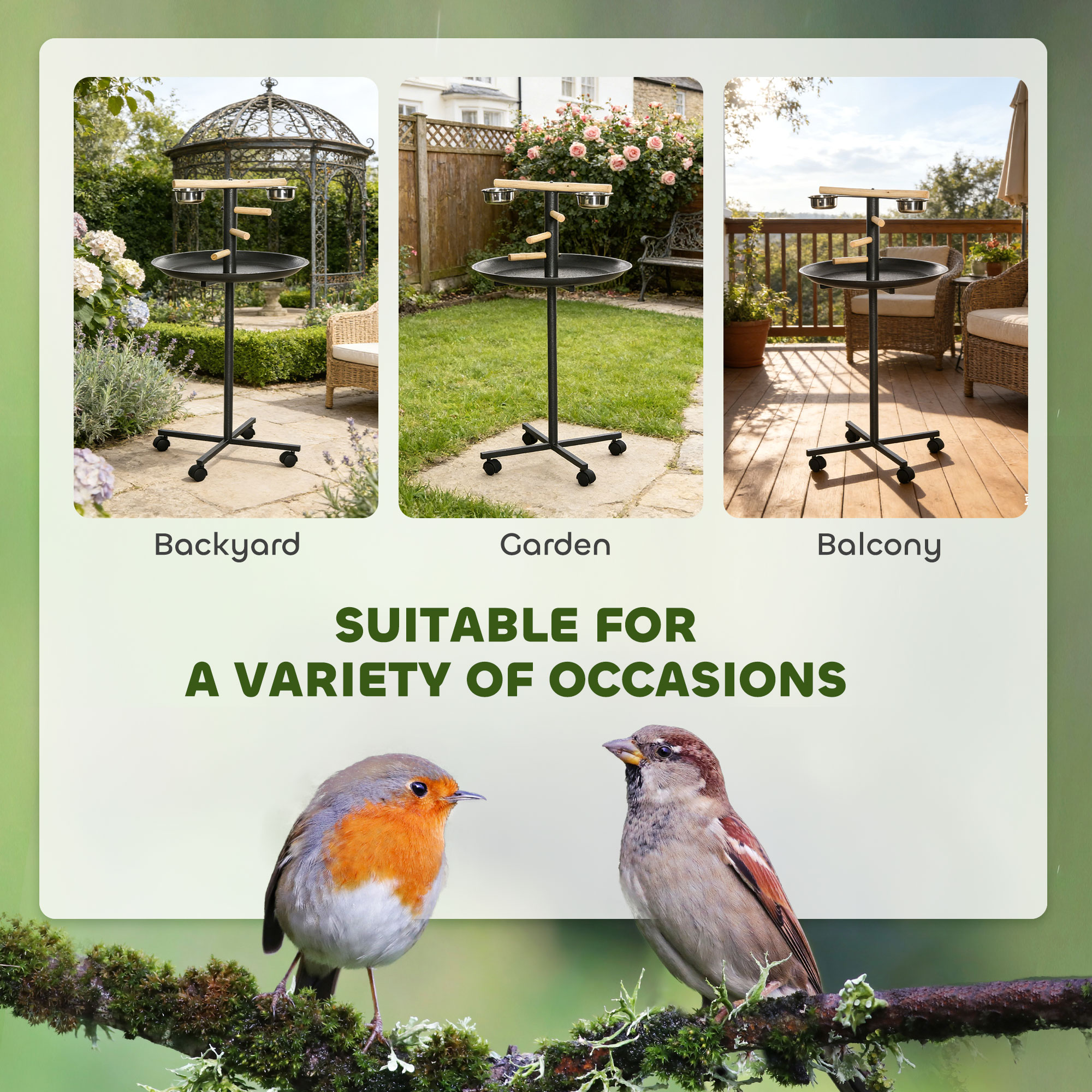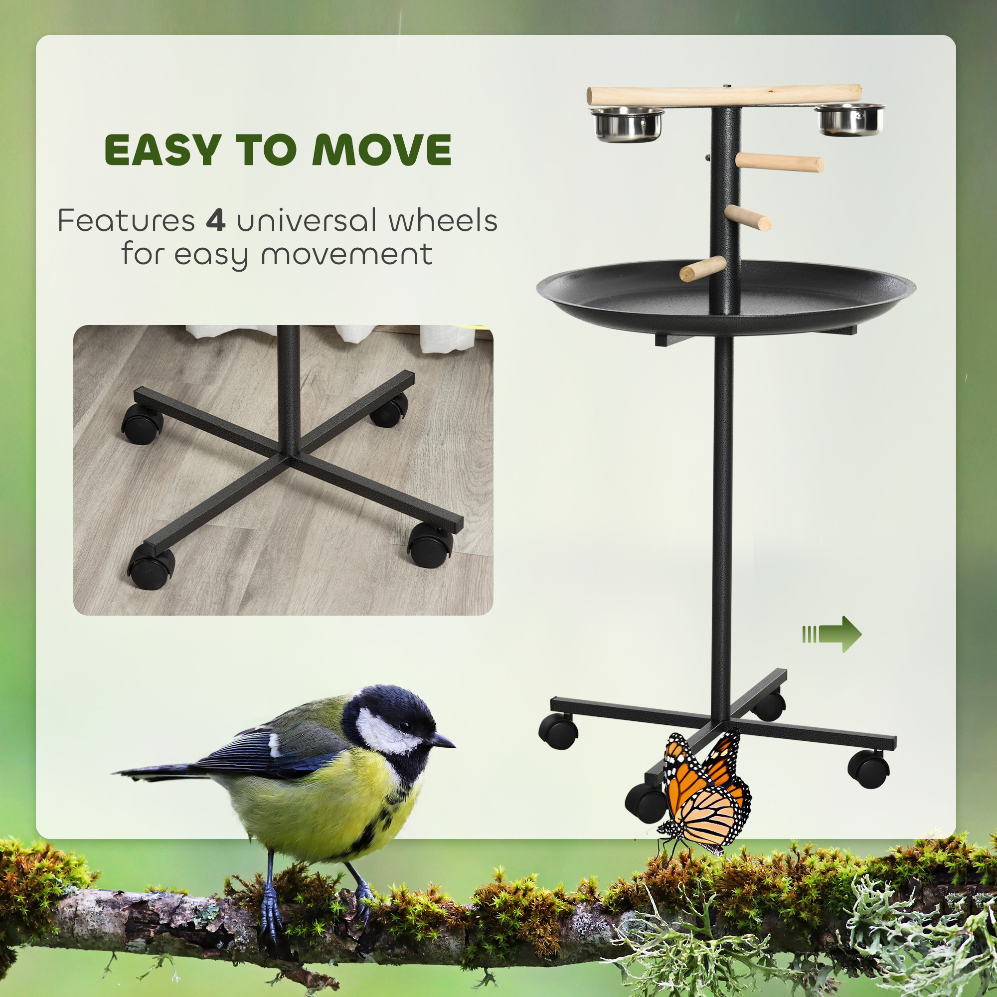 PawHut Parrot Perch Stand, Large Bird Play Stand, Metal Bird Table Feeder Station with Stainless Steel Bowls, Four Wheels, Round Tray, Black